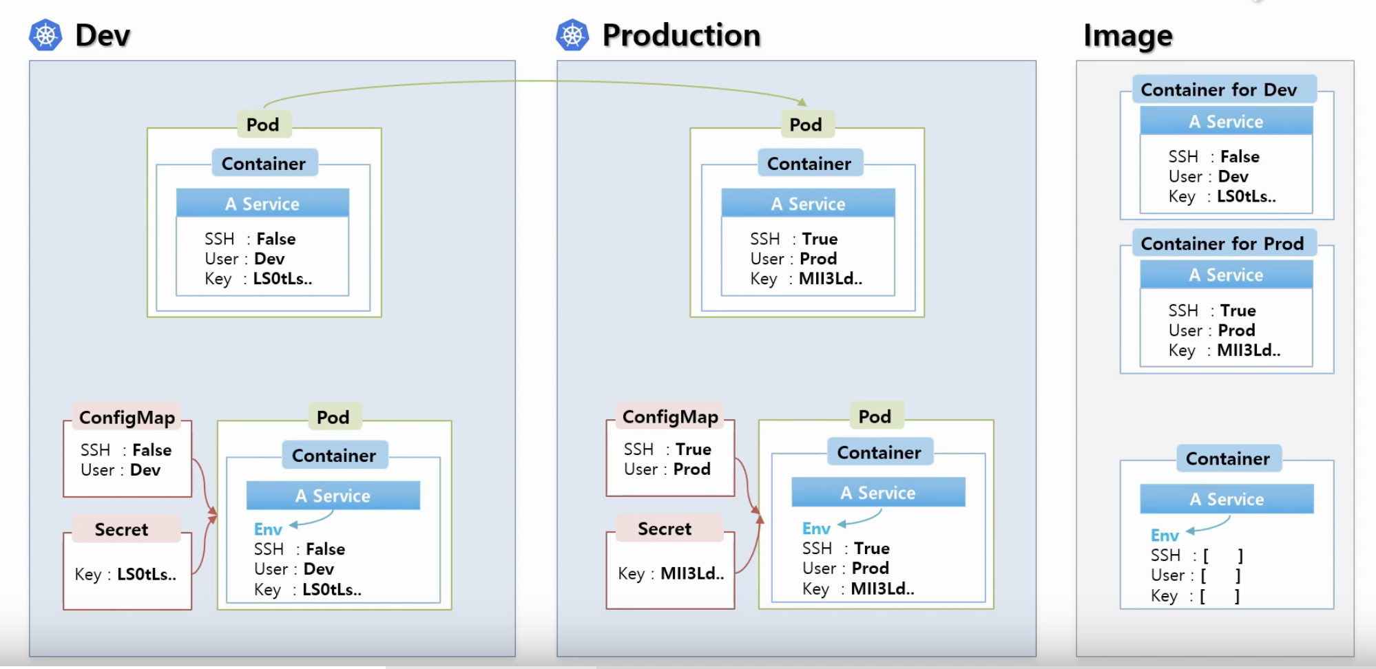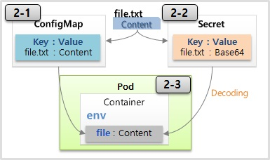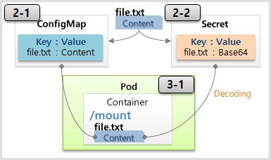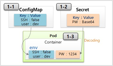 - pod 생성시 두 오브젝트(컨피그맵과 시크릿)를 연결할 수 있음